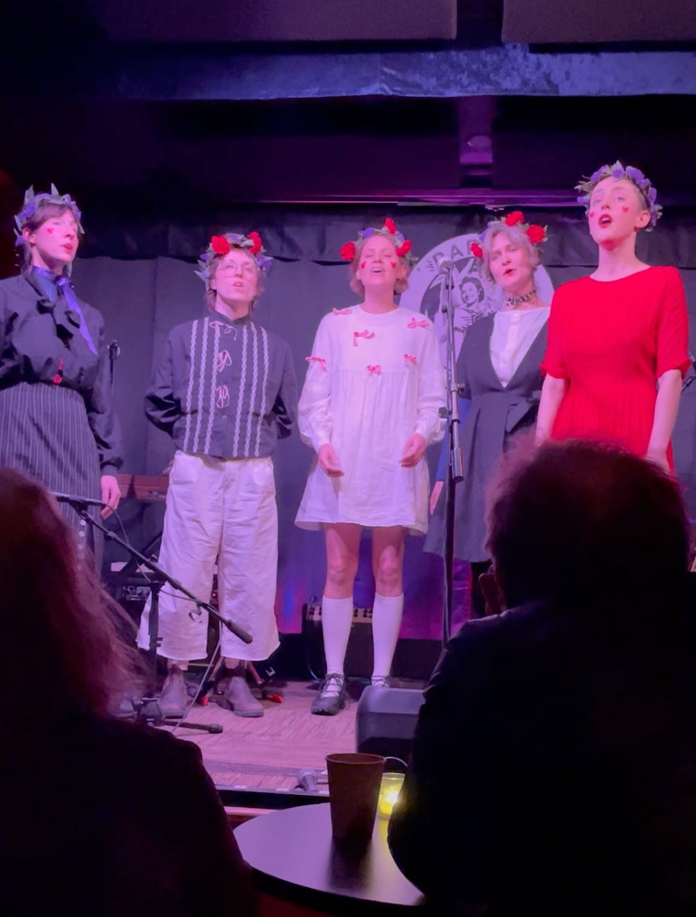 I am perpetually inspired by this group of people with whom I get to sing (missing Dana!). We’re called “Dream Choir” and this was our Valentine’s Day show. This is a still from a video my dear friend Rick took. Norma Jean made our headpieces (real flowers, y’all!) and I sewed a bunch of bows to my dress (a dress I’ve coveted since 2018 & acquired through a trade last month!) & embroidered hearts onto the sides of my long socks (because of course I did).
